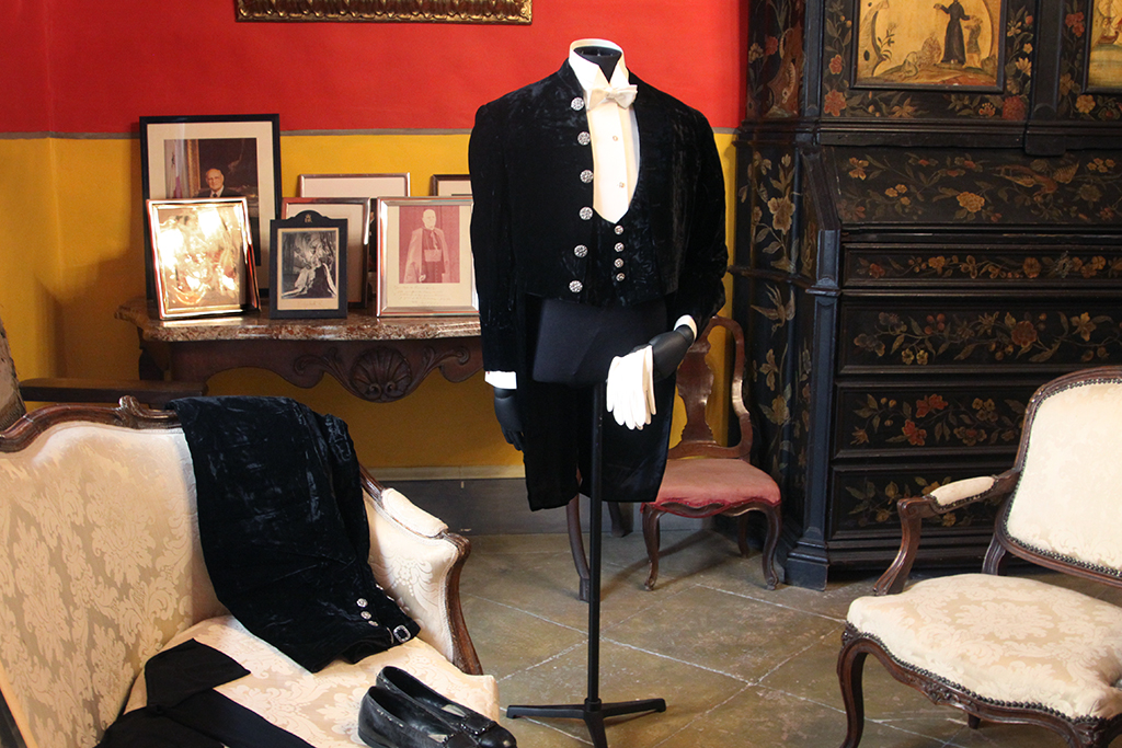 « Suivez-moi dans le dressing, nous invite le marquis, et venez admirer la robe que portait ma mère à l’occasion du couronnement de la reine Elisabeth II. Ma mère était une dame très humble, mais un couronnement est un couronnement et il fallait une robe somptueuse. Vous voyez le valet qui se trouve à côté ? Le costume qui y est accroché est celui que mon père portait à cette occasion. Vous êtes Suisses ? Savez-vous que mon père a fait ses études au collège Champittet de Pully ? »